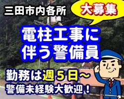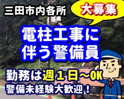 仕事内容 三田市内にて行われている電柱の電気工事(高所作業)にかかる交通誘導警備のお仕事です。